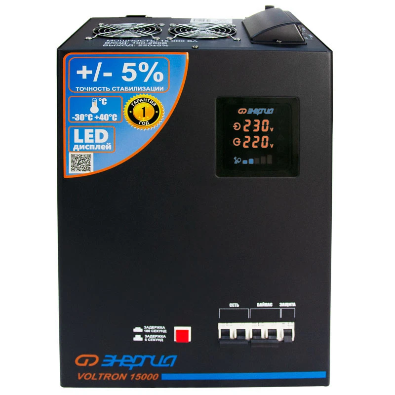 Мощность: 20000; рабочий диапазон: 105 - 265 Вольт; точность: 220 Вольт ± 5 %; время отклика: 10 мс; установка: Настенный.