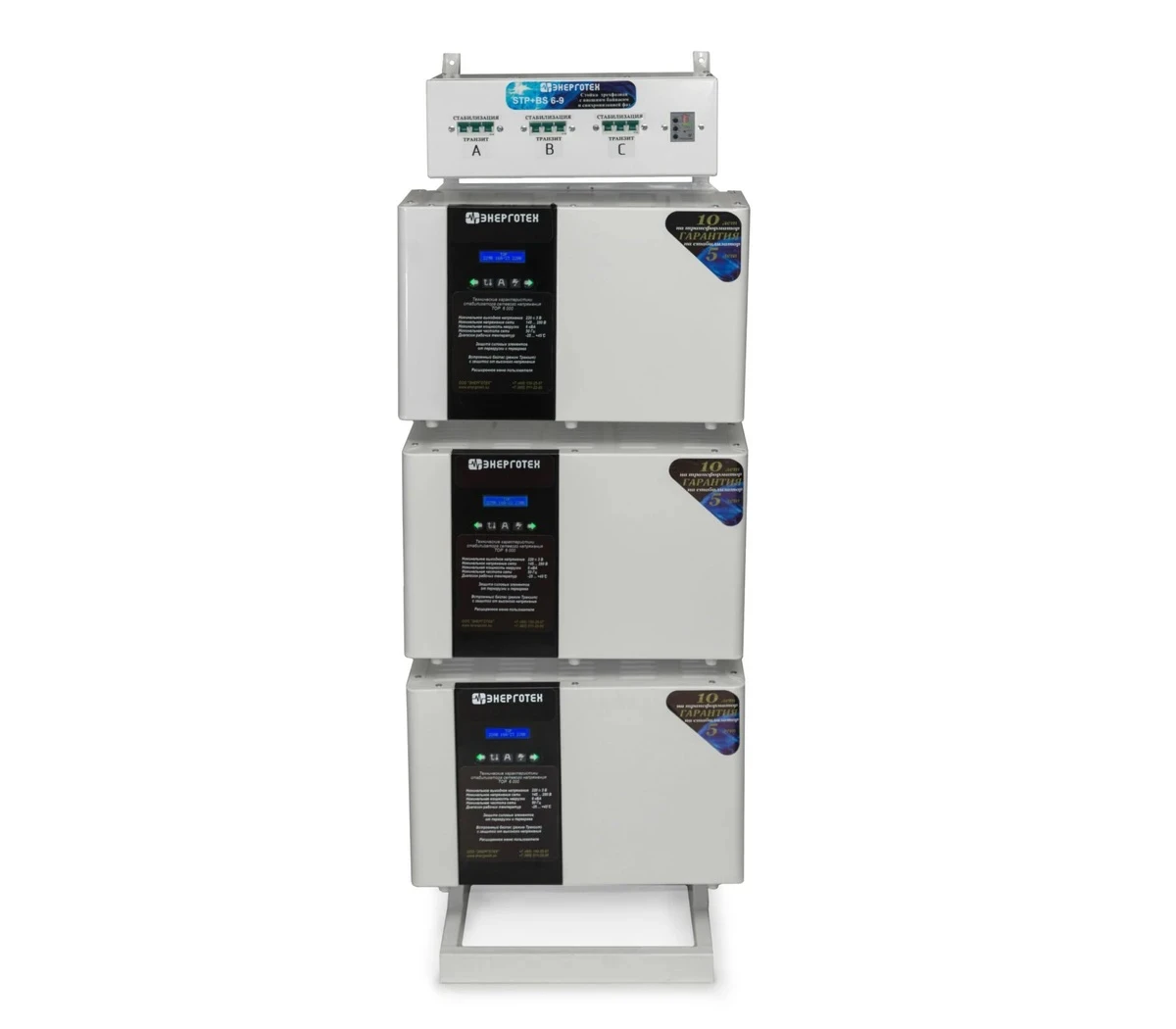 Мощность: 10000; рабочий диапазон: 155 - 255 Вольт; точность: 220 Вольт ± 5 %; время отклика: 40 мс; установка: Напольный.